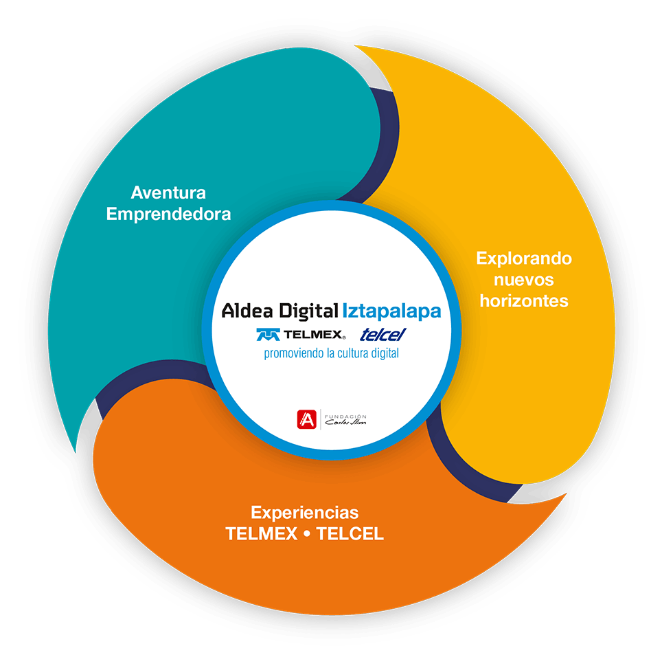 Aldea Digital Iztapalapa TELMEX TELCEL ofrece sus servicios de manera gratuita. Las actividades que se desarrollan en este espacio promueven la participación de: